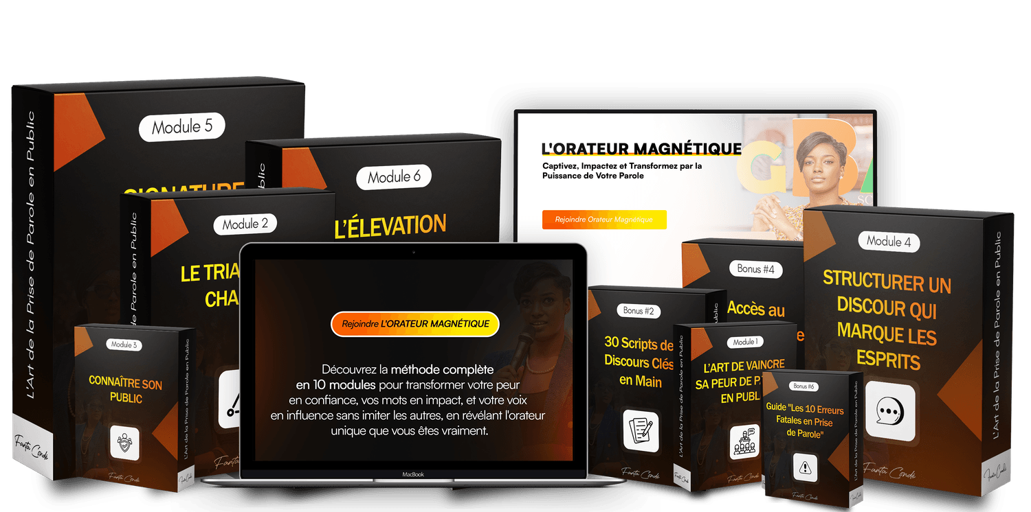Découvrez la méthode complète en 06 modules pour transformer votre peur en confiance, vos mots en impact, et votre voix en influence sans imiter les autres, en révélant l'orateur unique que vous êtes vraiment.